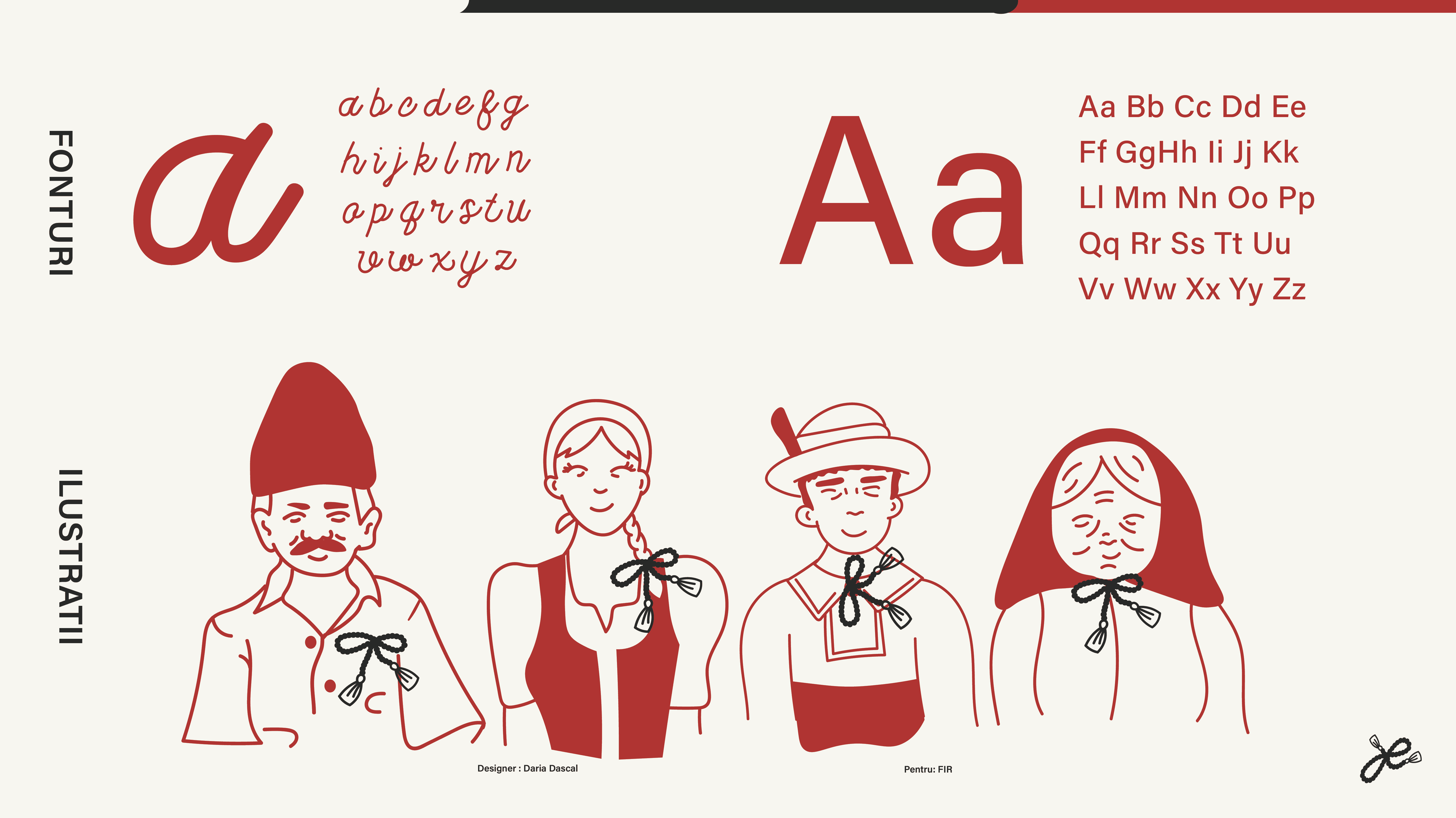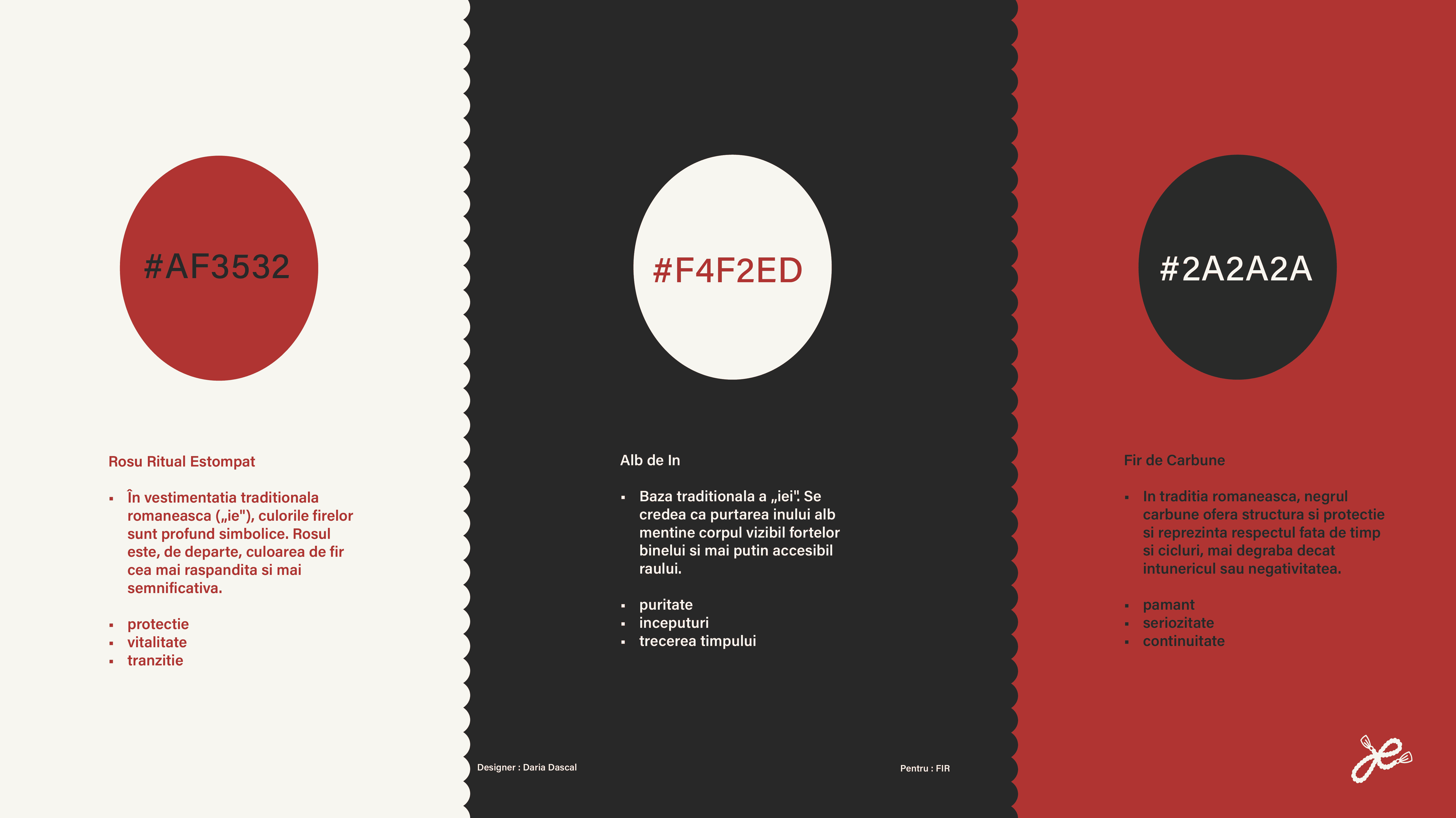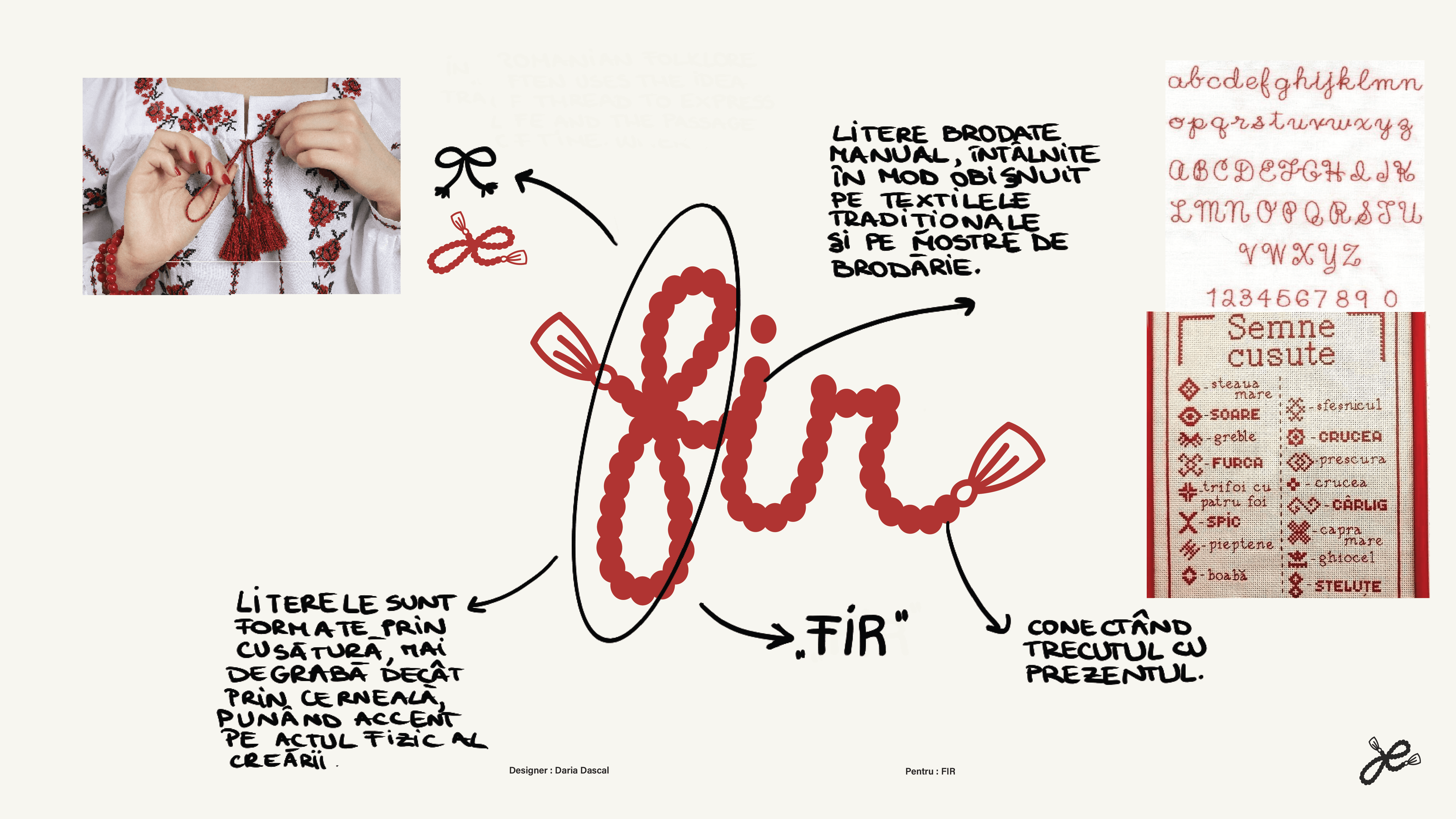Logo-ul traduce simbolicul „fir" românesc într-un logotip continuu, desenat manual, inspirat din tehnicile de țesut și broderie. Terminațiile subtile, asemănătoare unor noduri, fac trimitere la obiecte ritualice precum Mărțișorul, unde firul simbolizează reînnoirea, protecția și începuturile ciclice. Prin traducerea acestui simbol într-un limbaj vizual contemporan, logo-ul încadrează tradiția ca un sistem viu, în continuă evoluție, nu ca o formă istorică fixă.