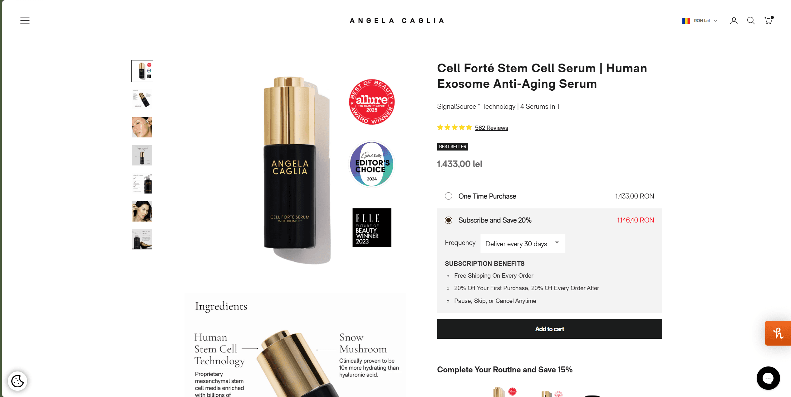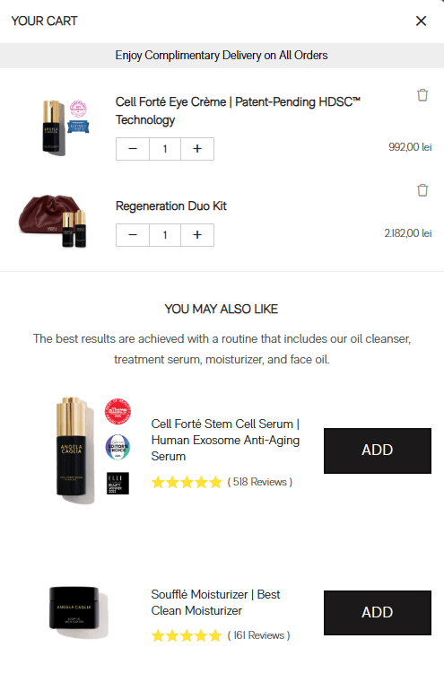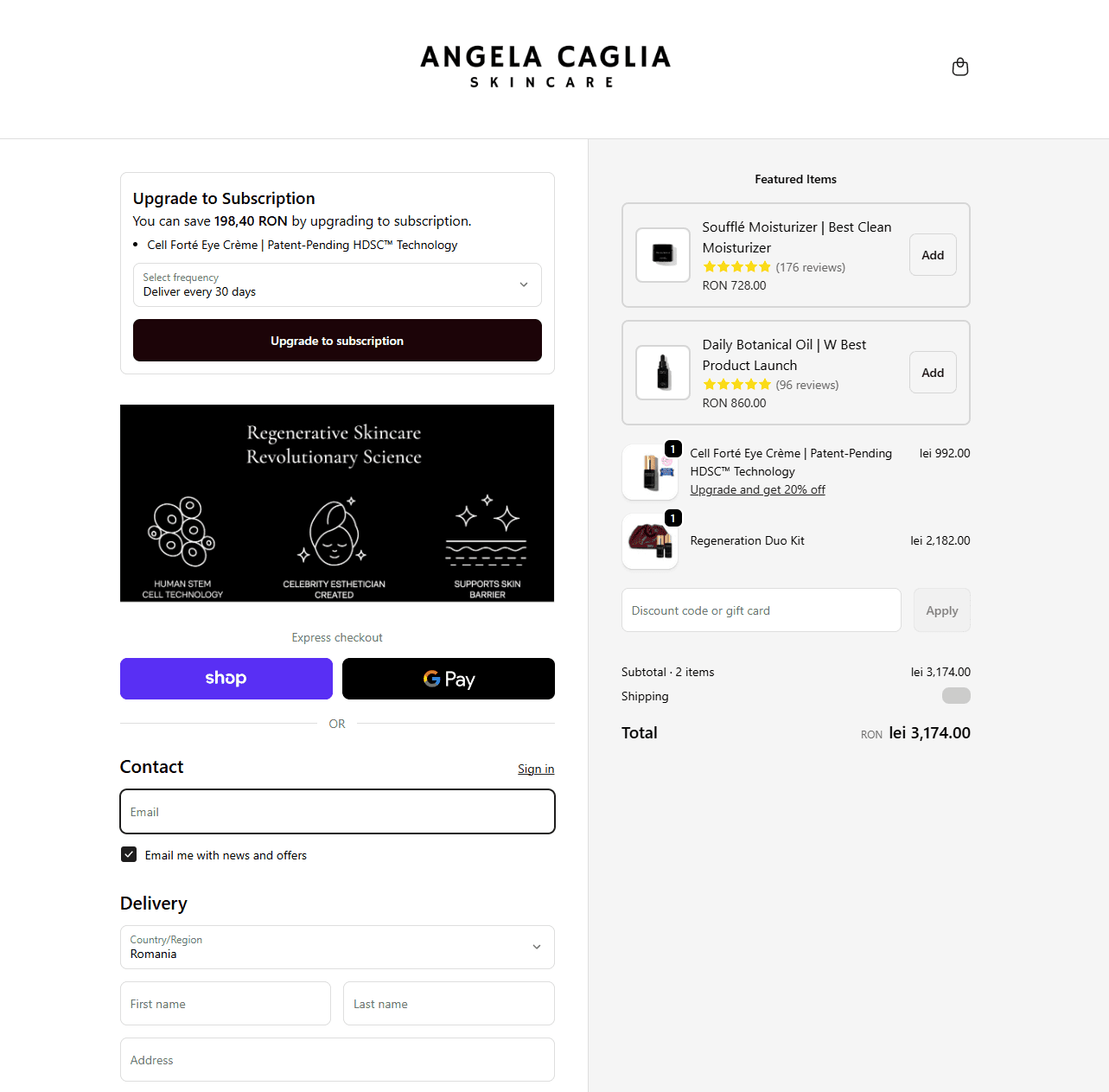 Sunt activate module native de tip „Subscribe and Save” pentru a facilita achiziția recurentă a tratamentelor. Coșul de cumpărături dinamic (slide-out cart) este optimizat cu un sistem de recomandări complementare („You May Also Like”), care impactează direct valoarea medie a comenzii într-un mod neintruziv.