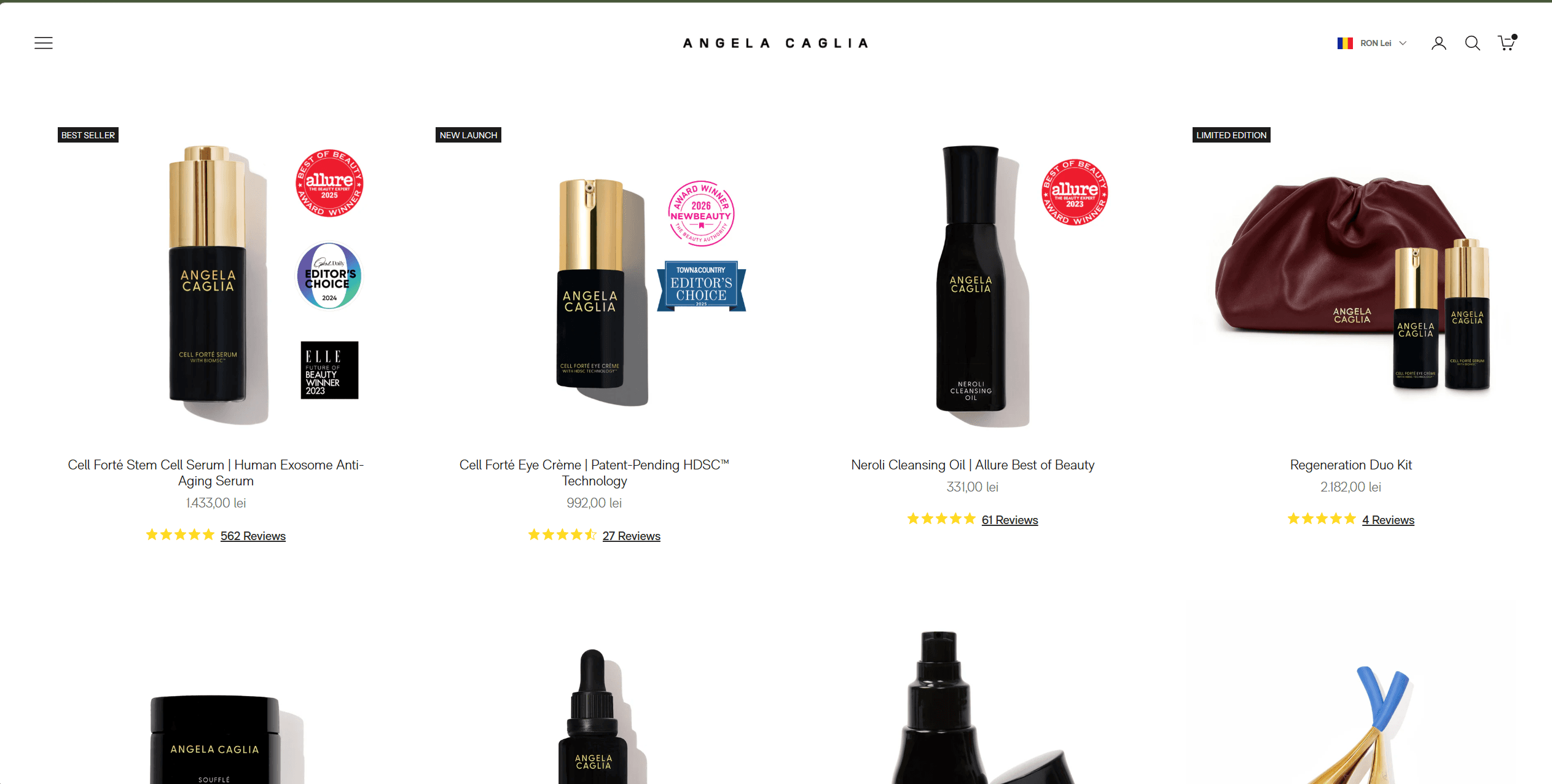 Interfața utilizează spații albe generoase și o tipografie rafinată, punând produsele în centrul atenției. Designul integrează strategic elemente de autoritate: badge-uri de la publicații de top (Allure, Elle, Vogue) și slidere interactive „Before/After”, pentru a valida vizual eficiența tratamentelor fără a încărca layout-ul.