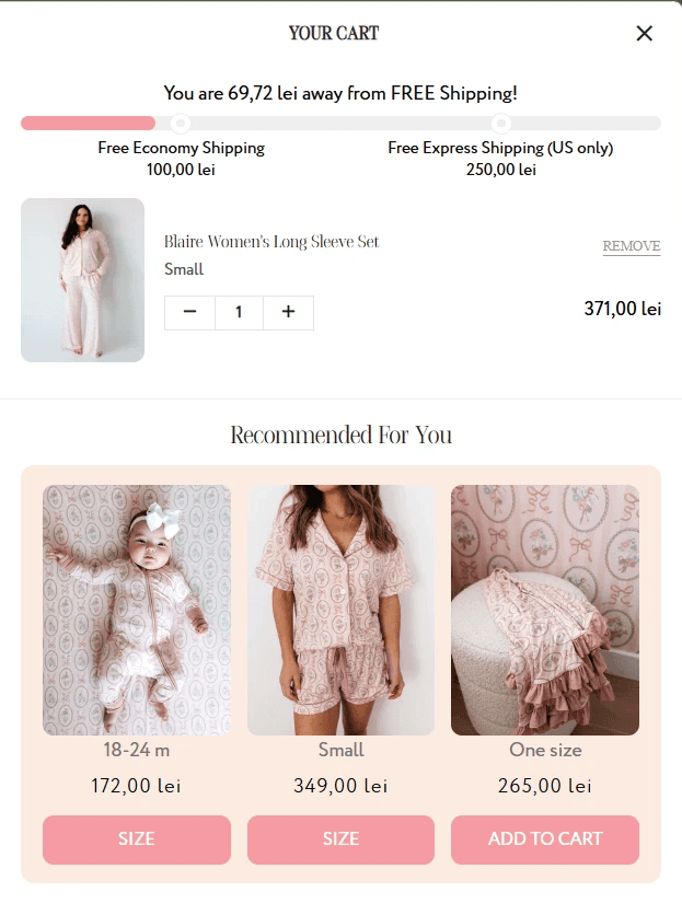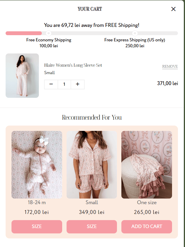 Pagina de produs și coșul de cumpărături (slide-out cart) funcționează ca un sistem activ de creștere a valorii medii a comenzii. Sunt implementate module de recomandări specifice („Perfect Pairings”, „Recommended For You”) și bare de progres pentru deblocarea transportului gratuit, optimizate pentru a nu întrerupe procesul fluid de plată.