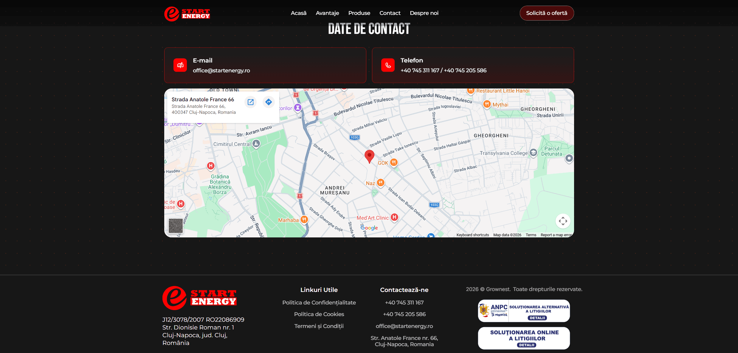 Funcționalitatea centrală gravitează în jurul modulelor de tip „Solicită o ofertă”, plasate contextual în paginile de produs. Sunt implementate integrări cu sisteme de cartografiere interactivă și fluxuri de contact rapid, facilitând legătura directă între inginerii companiei și potențialii clienți.