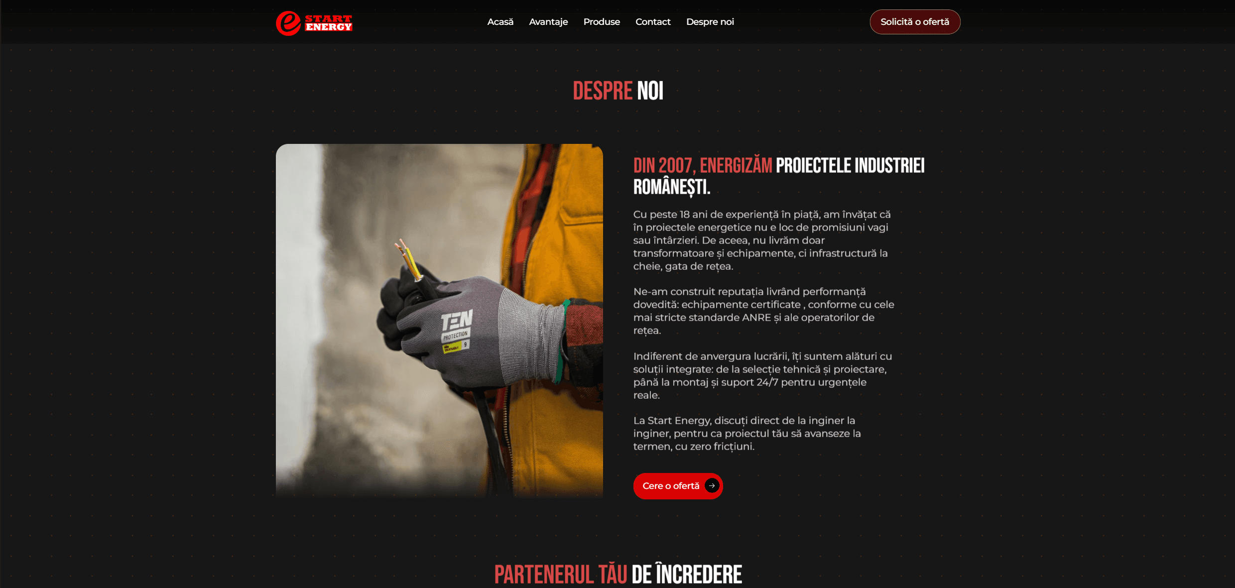 Interfața utilizează o temă „dark mode” accentuată de un roșu vibrant pentru a comunica vizual dinamismul energiei. Tipografia bold și layout-urile sobre susțin o prezentare tehnică riguroasă, eliminând zgomotul vizual și consolidând poziția de partener industrial de încredere.