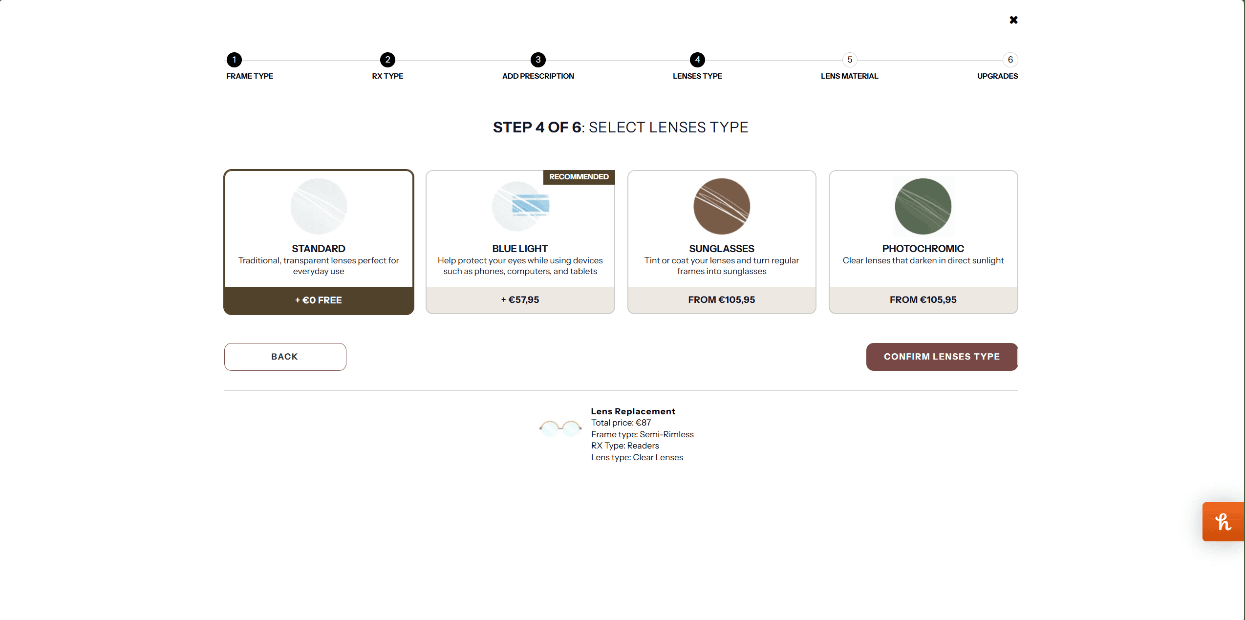 Navigarea este proiectată pentru a gestiona un catalog vast prin sisteme de filtrare detaliate (formă, material, potrivire a feței). Flow-ul principal ghidează utilizatorul printr-un configurator de lentile în 6 pași, descompunând decizii tehnice complexe, precum tipul de prescripție și tratamentele optice, într-un parcurs intuitiv, fără efort cognitiv.