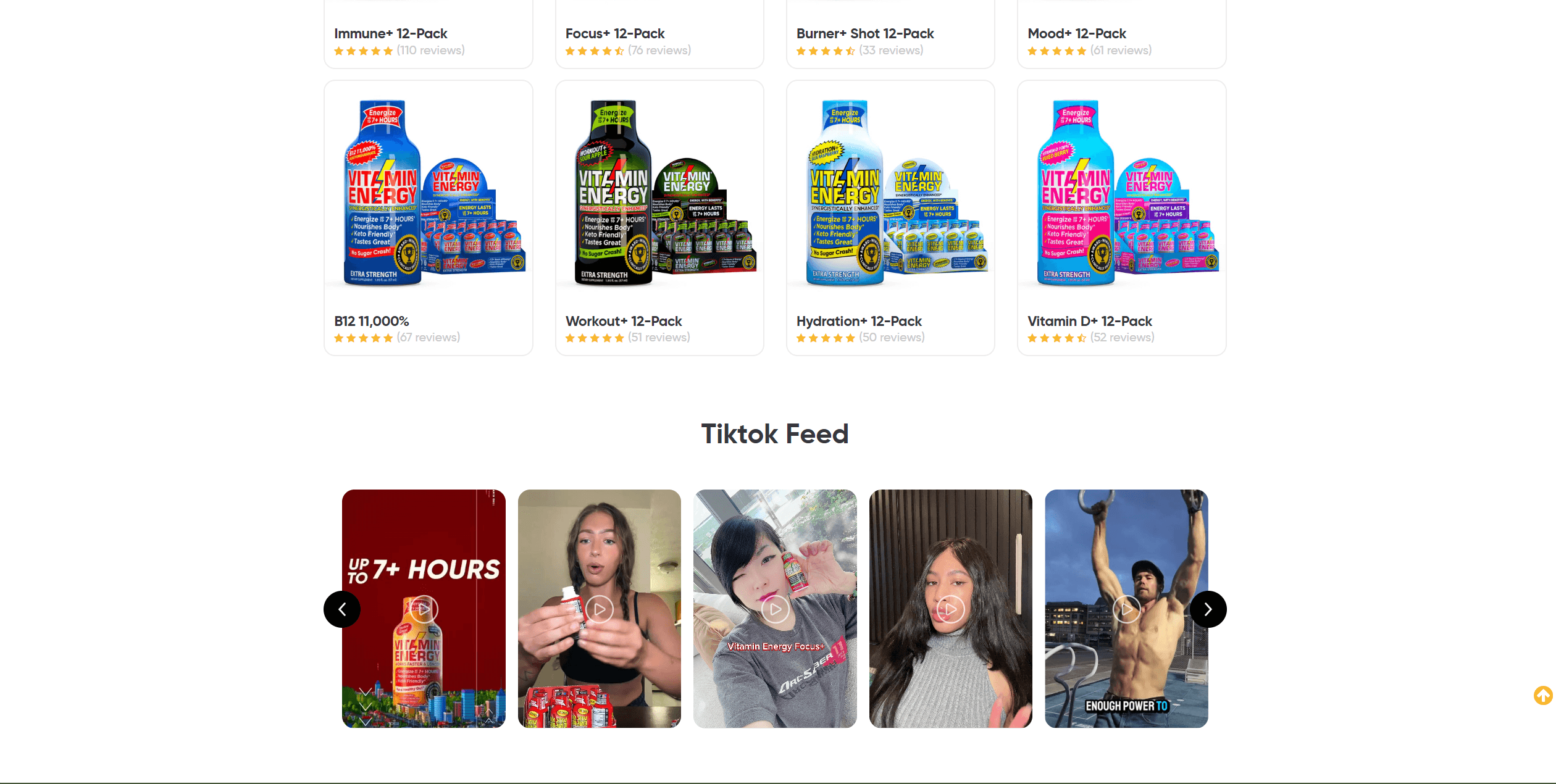 Navigarea este proiectată pentru decizii rapide, folosind o ierarhie clară între pachete, arome și beneficii funcționale. Parcursul elimină fricțiunea dintre intenție și adăugarea în coș, integrând elemente de social proof (TikTok feed, tabele comparative) direct în traseul de decizie al utilizatorului.