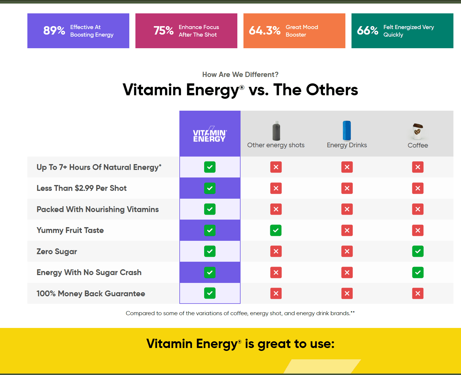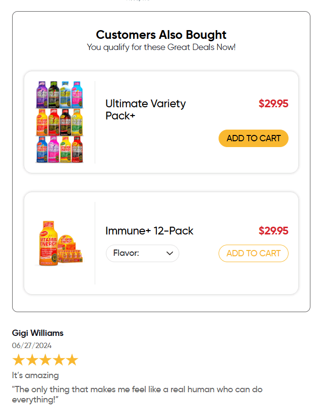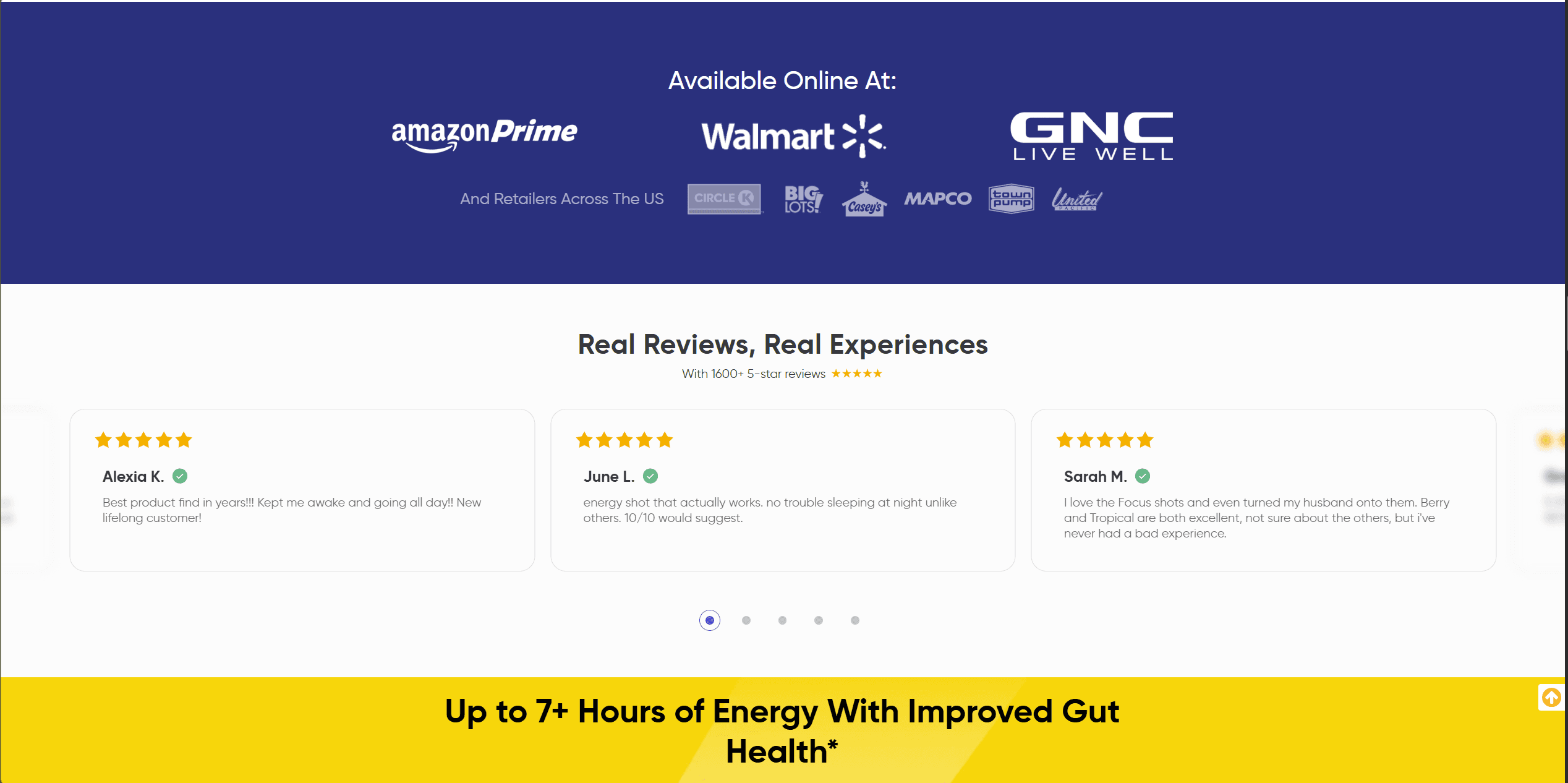 nterfața folosește un contrast cromatic puternic pentru a direcționa vizual atenția către butoanele de acțiune (CTA). Designul integrează strategic elemente de autoritate: review-uri reale și badge-uri de la retaileri majori (Amazon, Walmart), pentru a consolida încrederea și a valida decizia de cumpărare.